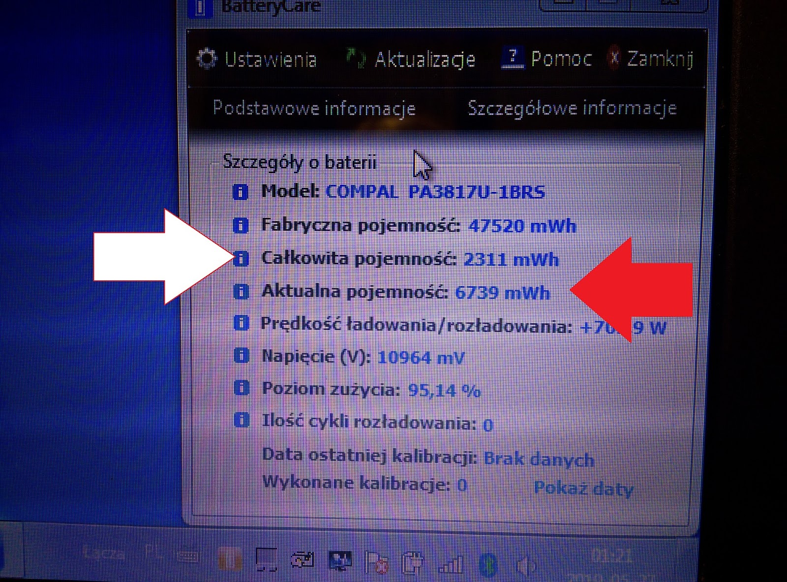 Laptop uruchamia się na nowej baterii, lecz cały czas jest informacja o zbyt małej pojemności baterii, mimo że wskaźnik poziomu ładowania pokazuje że mamy rosnącą pojemność aktualną (czerwona strzałka), to nadal mamy całkowitą pojemność tę którą mieliśmy przed wymianą ogniw (biała strzałka) i według tej pojemności bateria działa i się rozładowuje, mimo że zarówno poziom napięcia jak i pojemność realna jest całkiem inna i możliwa dla dalszej pracy baterii