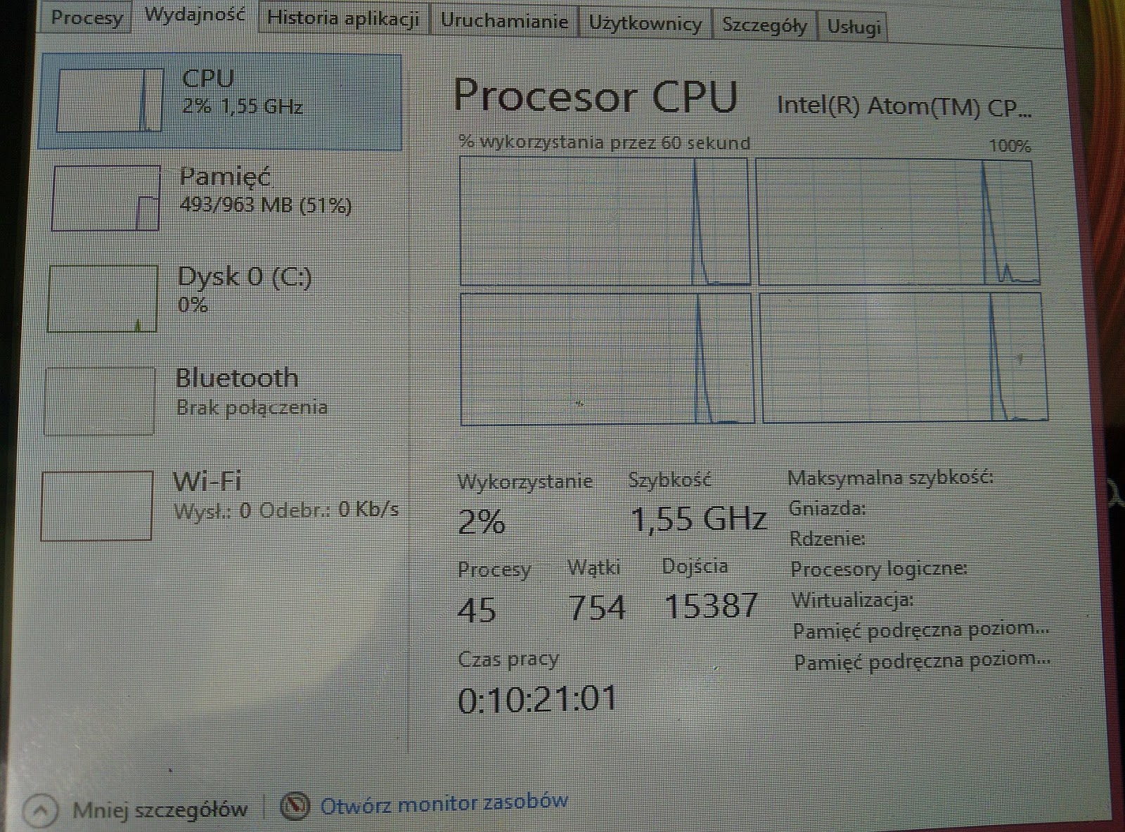 Pamięć RAM jaką system pobiera to około 400 megabajtów, a zużycie procesora w trybie spoczynku znikome