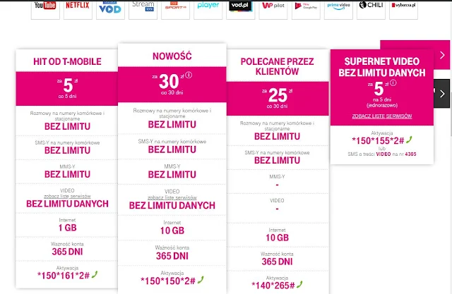 Najkorzystniejsza oferta jak do tej pory jest naszym zdaniem w t-mobile, za 30 zł na miesiąc dostajemy nielimitowane rozmowy i sms do wszystkich sieci, oraz pakiet 10 giga a dodatkowo brak limitu transferu do największych portali video: